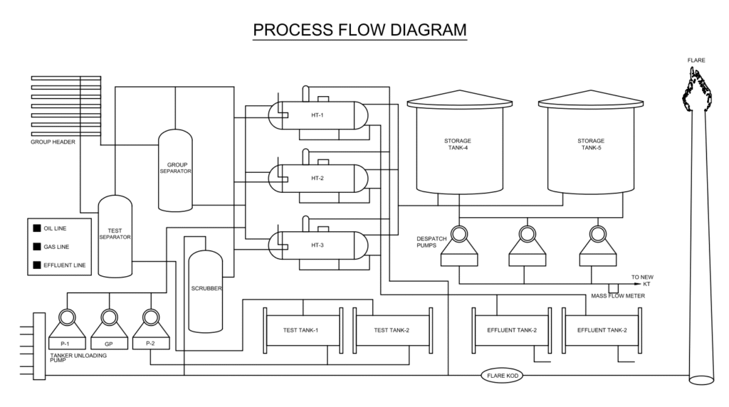 • Shows process flow: It clearly displays how fluids and gases move through equipment and pipelines.